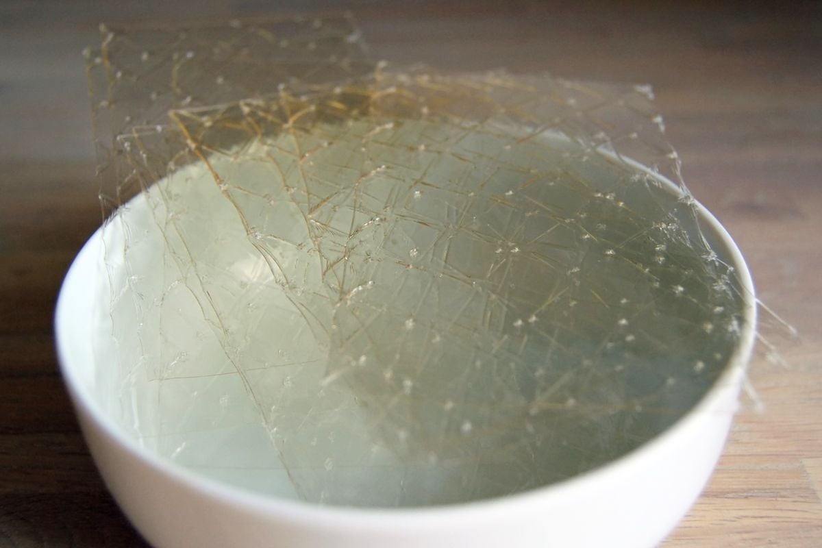 Image : Fines plaques de gélatine transparentes posées sur un bol, dans lequel elles semblent être destinées à être dissoutes. (crédit : Danielle dk – Wikimedia Commons)