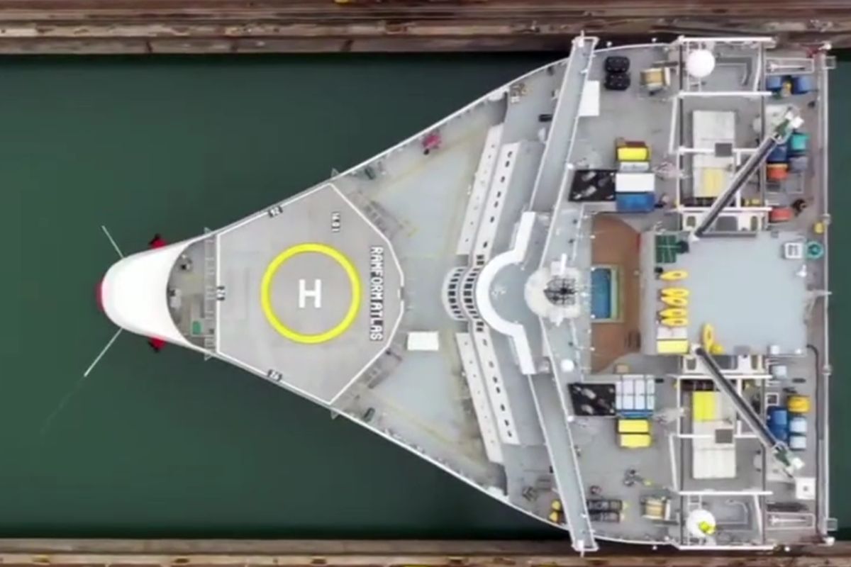 On y trouve des cabines individuelles, une salle de sport, un sauna, une piscine extérieure, et même un terrain de basket couvert. L’hélicoptère qui atterrit sur le pont avant apporte vivres, matériel et relèves sans que le navire n’ait besoin de s’arrêter.
