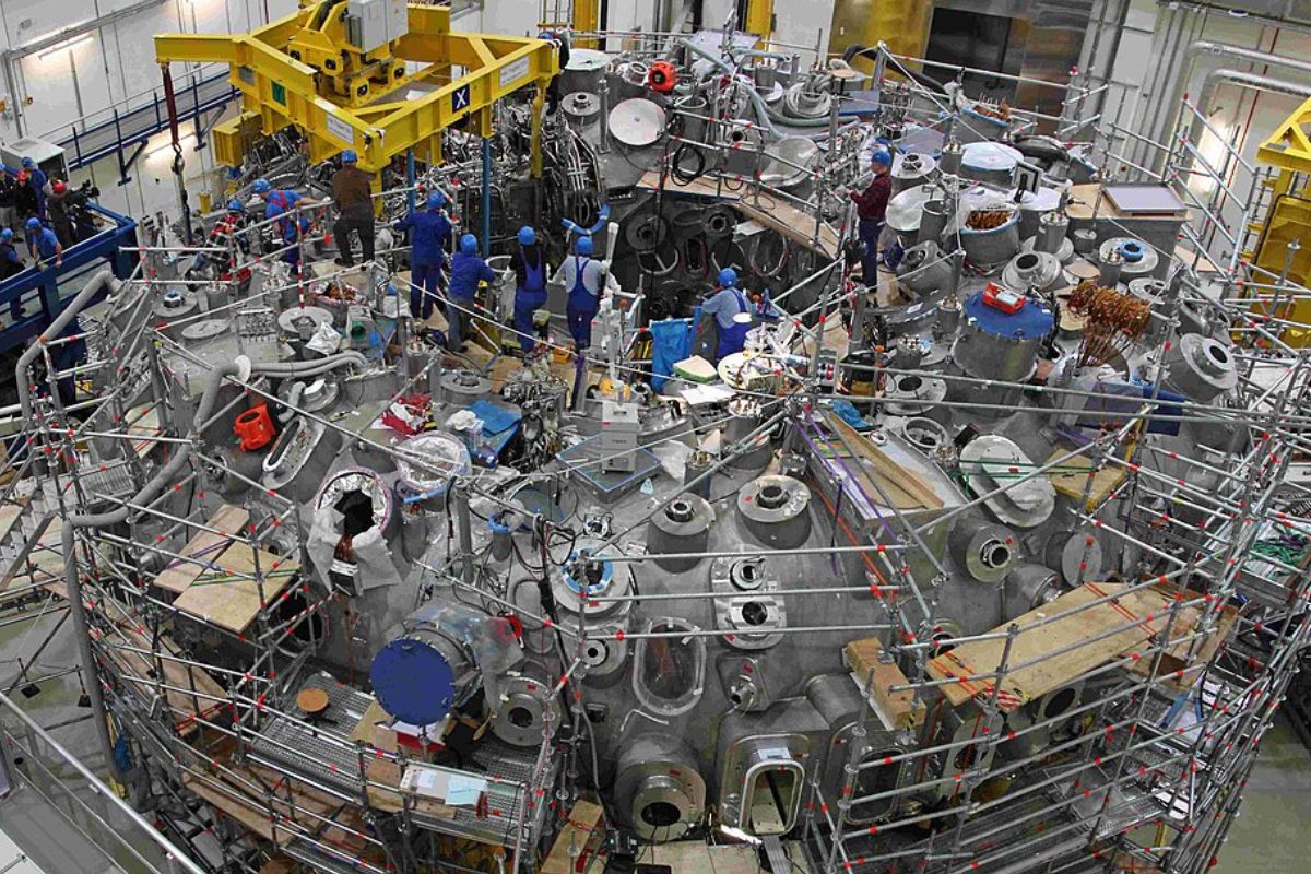 Image de mise en avant : Le dernier des cinq modules de l’expérience stellarator Wendelstein 7-X, installé en 2011 (la production du premier plasma remonte à 2015).