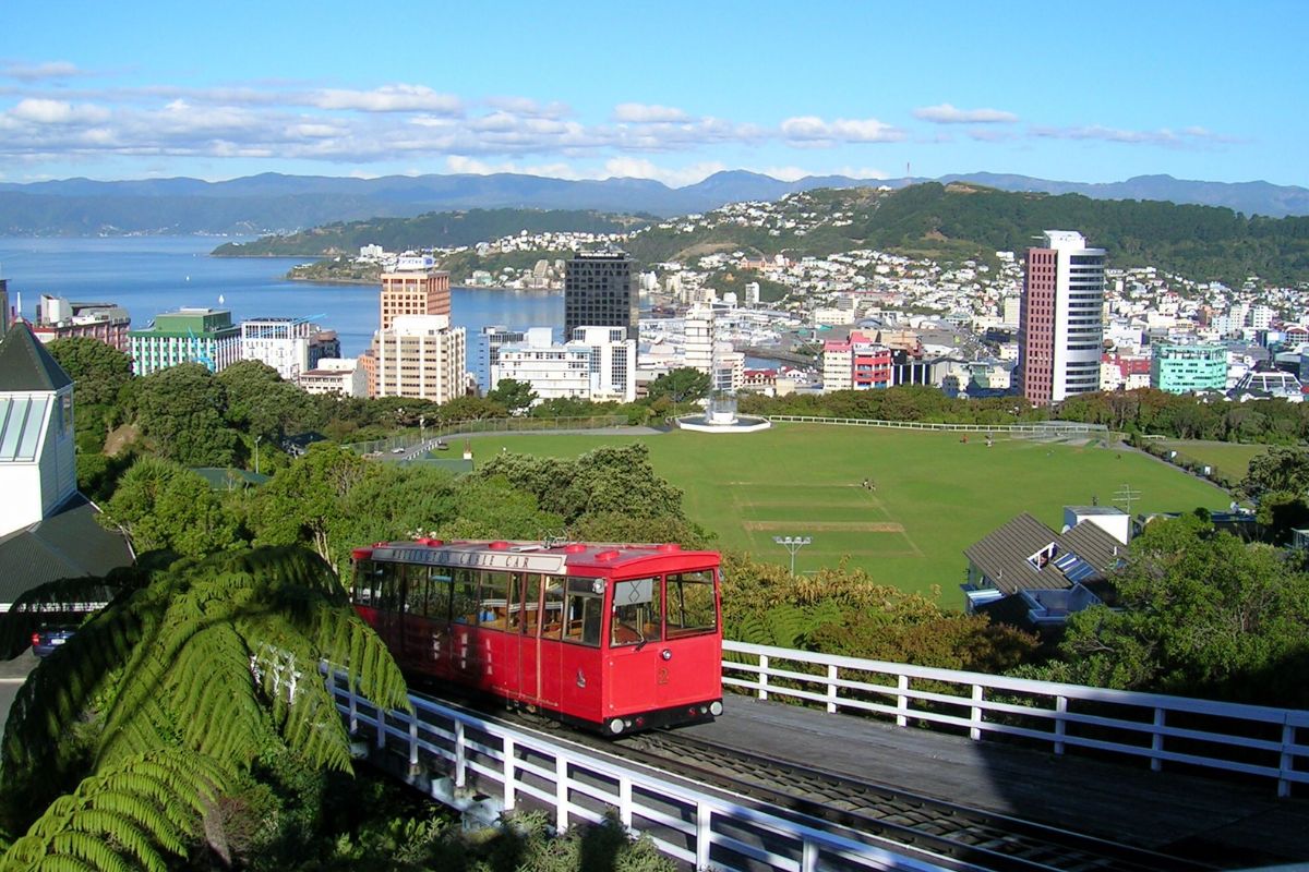 Au premier plan, l’un des deux funiculaires de Wellington (capitale de la Nouvelle-Zélande). Le grand immeuble rouge et argent sur la droite est le Majestic Centre, le plus haut bâtiment de Wellington. L’immeuble noir au centre est le bâtiment de State Insurance (anciennement le BNZ Centre Building). Derrière les bâtiments du premier plan s’étend le centre-ville de Wellington. À gauche, l’eau correspond au port de Port Nicholson. La montagne juste derrière la ville est le mont Victoria, d’où l’on profite de nombreux points de vue et de belles photos – crédit : Brett Taylor