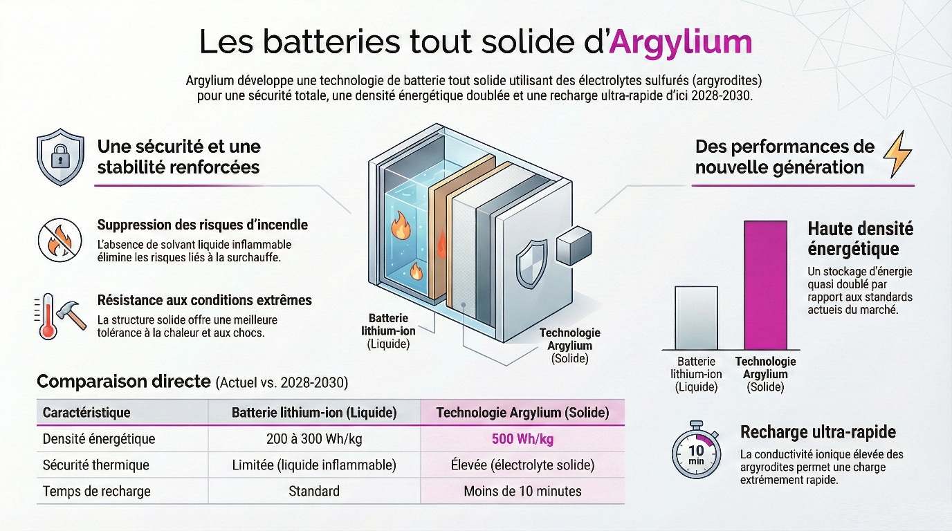 À Rueil-Malmaison, Argylium vient d’entrer en activité avec un objectif simple à formuler et long à atteindre : devenir le leader européen des électrolytes solides sulfurés, appelés Sulfide Solid Electrolyte / SSE (en français « électrolytes solides sulfurés »), au cœur des batteries tout solide, ou All Solid State Batteries / ASSB (en français « batteries tout solide »).