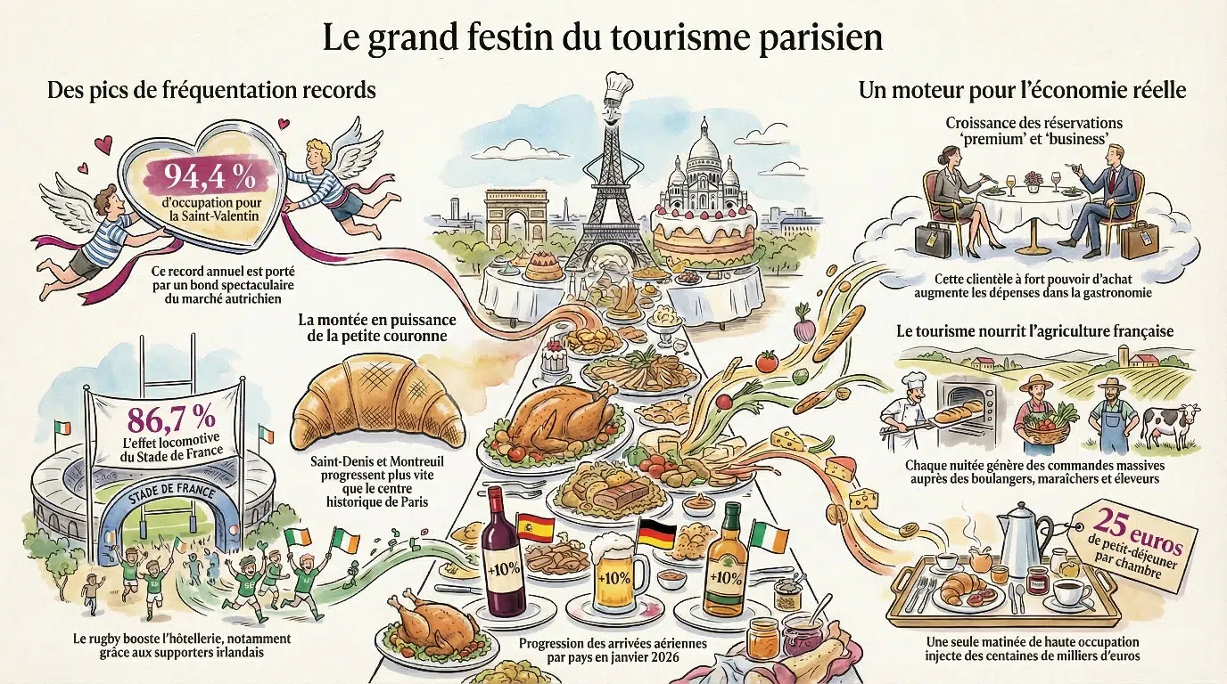 Paris fonctionne comme un immense restaurant ouvert sur le monde et les chiffres de février 2026 montrent une chose très simple : la machine continue de tourner.