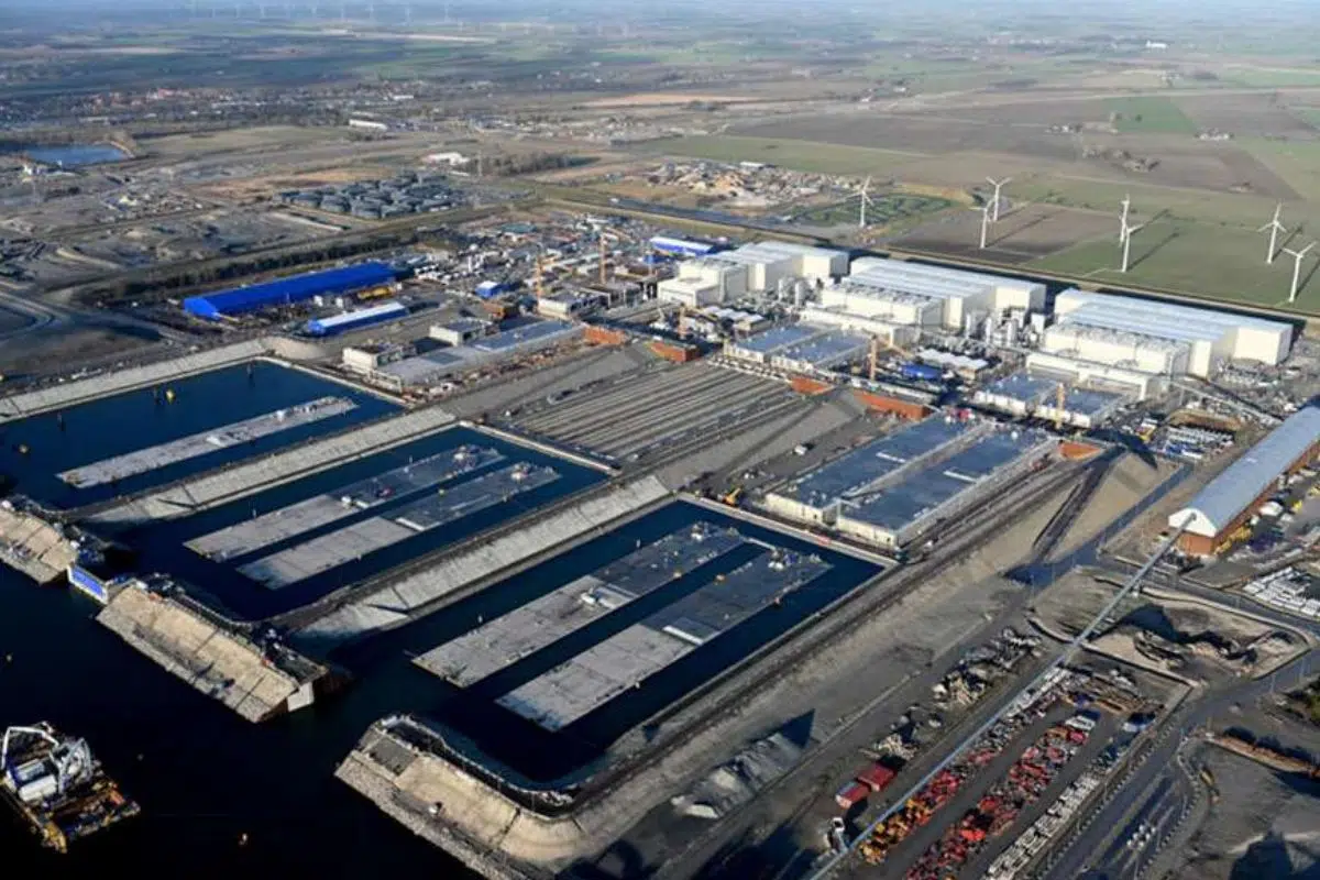 Au lieu de creuser sous la mer, les ingénieurs fabriquent le tunnel à terre, dans un immense bassin industriel (ici situé sur l’île danoise de Lolland). Chaque morceau est ensuite transporté vers le détroit et déposé dans une tranchée creusée au fond de la Baltique.