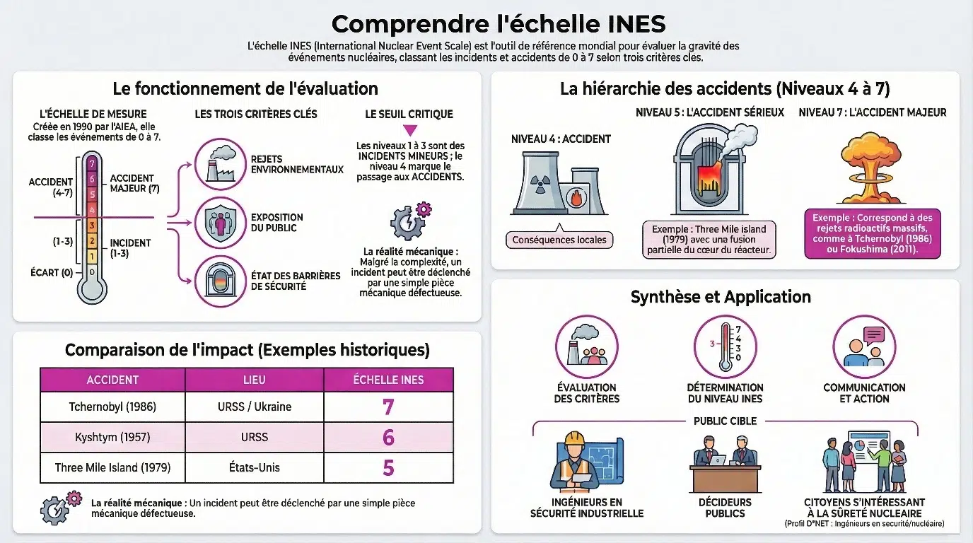 Pour évaluer la gravité d’un événement nucléaire, les autorités utilisent l’échelle INES (International Nuclear Event Scale, en français « échelle internationale des événements nucléaires »).