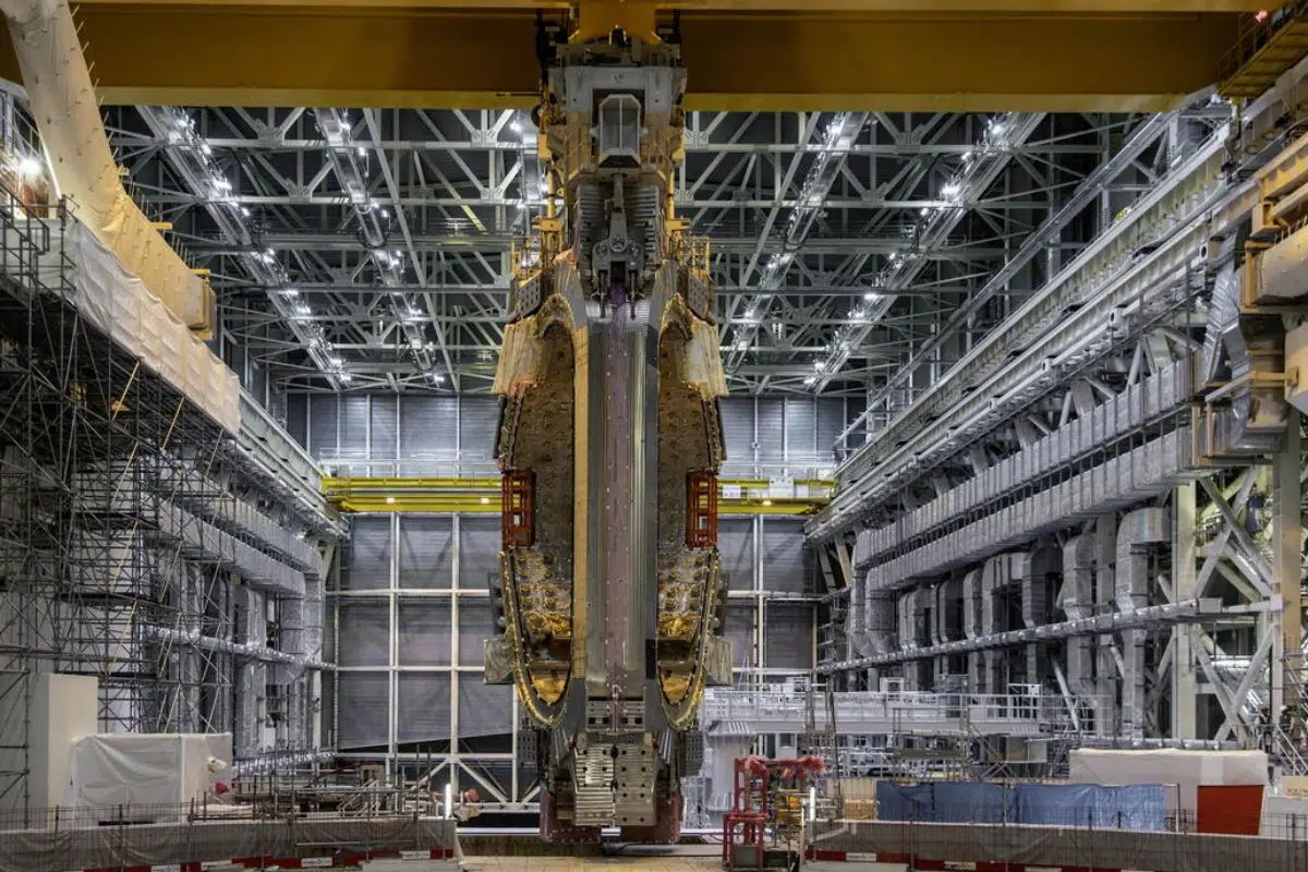 Son chantier entre désormais dans une phase délicate, celle où tout doit s’imbriquer avec une précision quasi chirurgicale. D’un côté, la chambre à vide commence réellement à prendre forme avec déjà quatre modules de 1 300 tonnes installés, dont le dernier posé en janvier 2026 avec une tolérance réduite à seulement 0,4 millimètre sous contrainte, un niveau de précision rarement atteint à cette échelle industrielle. De l’autre, un chantier parallèle se met en place pour préparer l’intérieur du réacteur : près de 20 000 composants doivent encore être installés dans un espace extrêmement contraint.