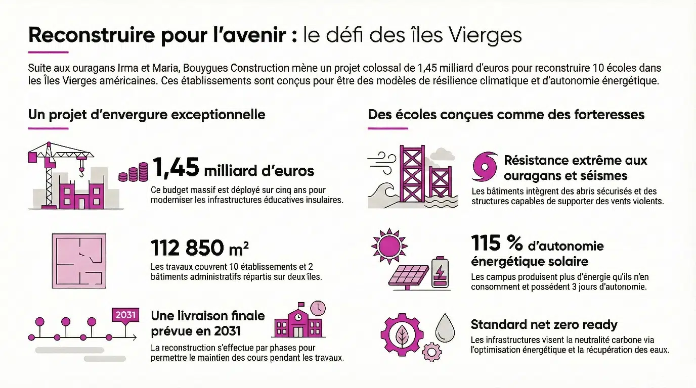Après les ouragans Irma et Maria en 2017, les infrastructures éducatives de Saint-Thomas et Sainte-Croix ont été profondément endommagées. Neuf ans plus tard, un programme massif de reconstruction entre dans une phase décisive, porté par Bouygues Construction via sa filiale Americaribe. Objectif : rebâtir plus résistant, plus durable, et surtout mieux adapté aux défis climatiques à venir.