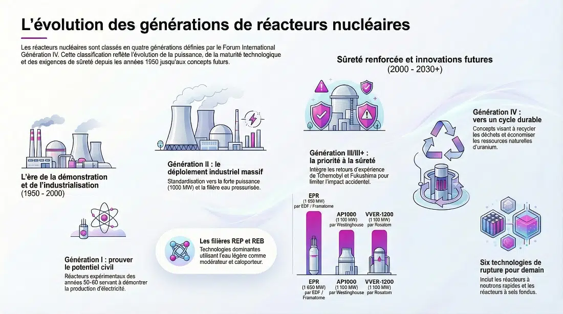 L’histoire du nucléaire civil se raconte en générations, chacune marquant un bond en termes de sûreté, d’efficacité et d’ambition.
